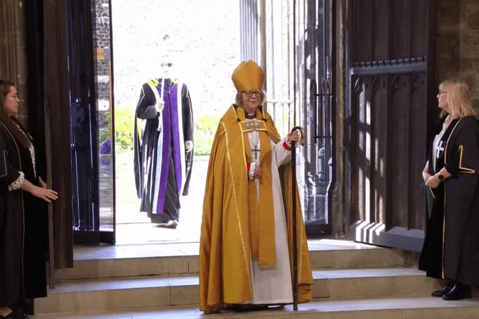 Before her installation, Mullally chose to travel to Canterbury by foot, leaving London on March 17 on a six-day walking pilgrimage across about 140 kilometers (or about 87 miles), accompanied by her husband, Eamonn, and others. They followed the Becket Camino route, from St. Paul’s Cathedral to Canterbury Cathedral.